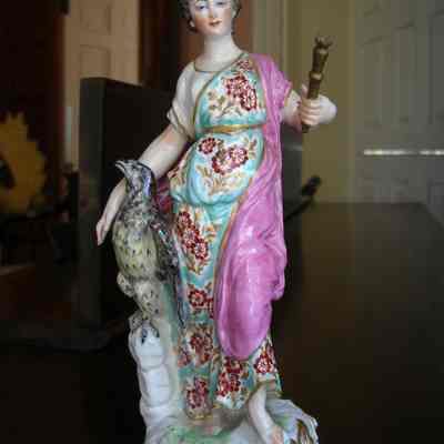 Allegorical Figure of a goddess, Hebe, on Gilt and White Rococo Base. Wearing Light Blue Robe with Sprigs of Gilt and Deep Red Flowers. Drape of Light Purple Over Left Shoulder. Wearing Gold Crown, Carrying Scepter, with Eagle To Right.