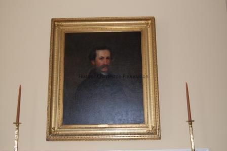 This oil on canvas painting is a portrait of a middle aged man with brwon hair and a brown moustache. His clothes appear boscured by disrupted varnish. the background is apparently dark and featureless. The painting has been previously restored including cleaning, overpainting, mounting on a wooden panel and revarnishing. At present, the painting is disfigured extensively by severely blanched varnish, the result of extreme exposure to water.