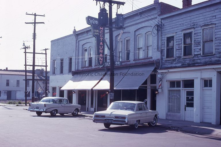 Color photograph (Kodachrome II slide) of Henry's Restaurant (50-54 North Market Street), street (front) elevation. Neon sign for the restaurant projects from the building. Two cars parked in front of building. Charleston Barber Shop (48 North Market Street) is at the right.Photograph Details