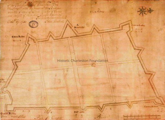 Photographic reprint of the drawing of the original configuration of the fortification wall that surrounded Charles Towne. Original housed in the collection of The British Public Records. Features the Granville Bastion, Half Moon Battery, Craven Bastion, Carteret Bastion, Drawbridge, Colleton Bastion, and Ashley Bastion.