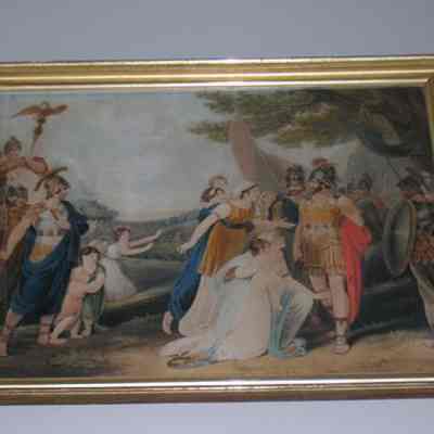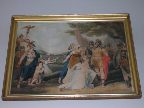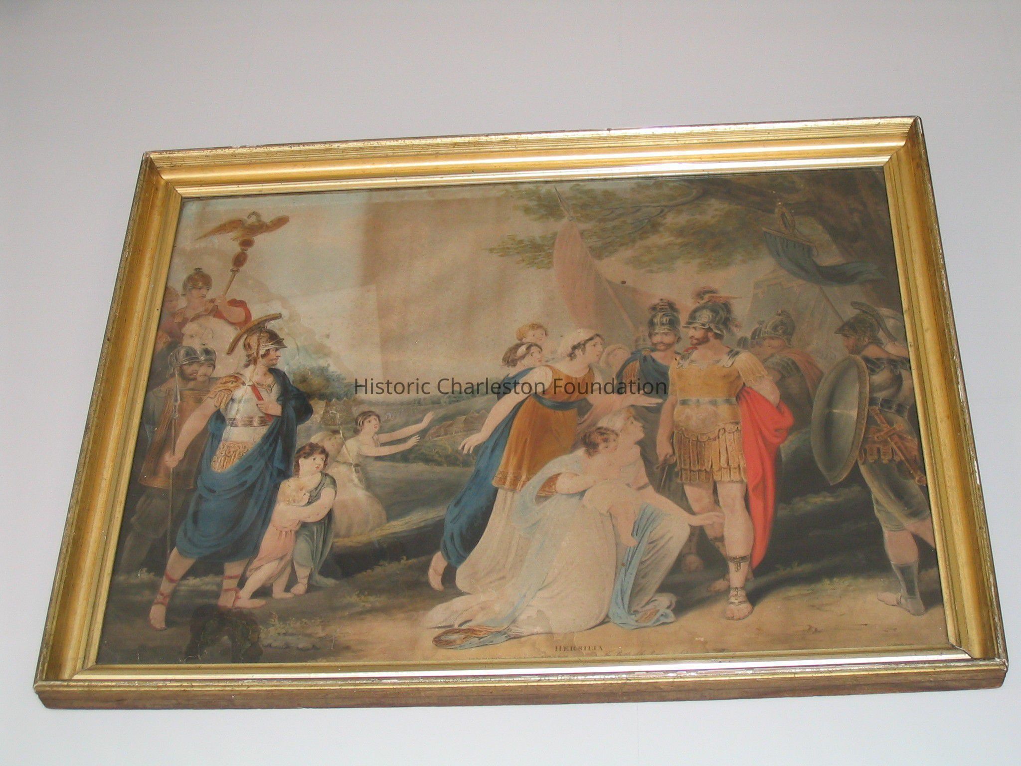 Old repairs at lower left corner, small holes along flag and Hersilia's blue drape.