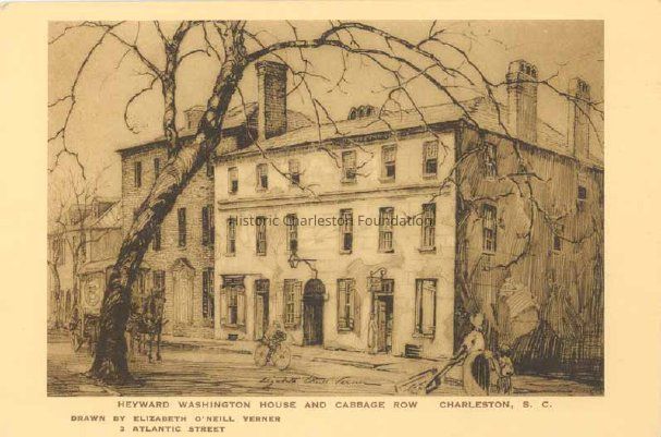 Postcard (scan) featuring a drawing of the Heyward Washington House and Cabbage Row by Elizabeth O'Neill Verner. Early 20th century view.Collection
