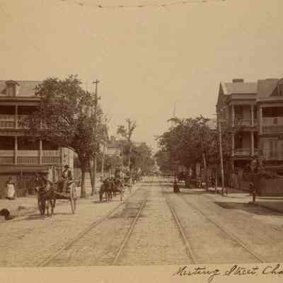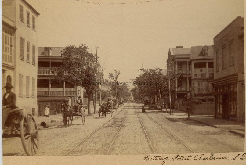 b: View looking north on Meeting Street from Water Street featuring 43 Meeting Street before the piazzas were removed (bottom left) and 42 Meeting Street (bottom right), along with houses to the north of both. Several mule-drawn carts are traveling on the street, along with pedestrians. Trolley tracks run through the center of the street. Captioned "Meeting Street, Charleston, S.C."