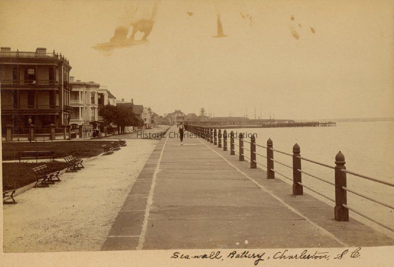a: View of the High Battery, looking north. The northeast corner of White Point Gardens (Battery Park) at left, along with the row of East Battery houses, particularly 1 East Battery and 5 East Battery. The Missroon House and its neighbors are seen in the distance. A young man walks on the promenade. Captioned "Sea Wall, Battery, Charleston, S.C."