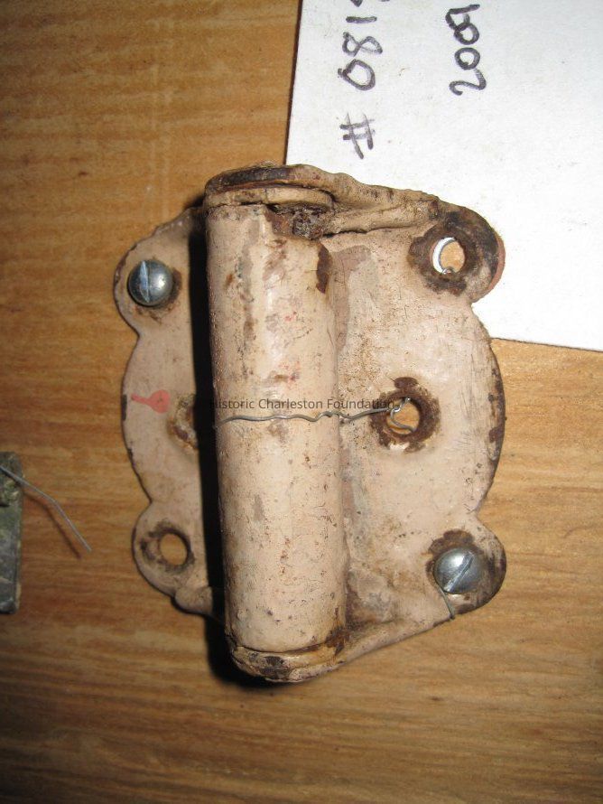 One of two spring-loaded screen door high-tension hinges made of stamped steel.Collection
