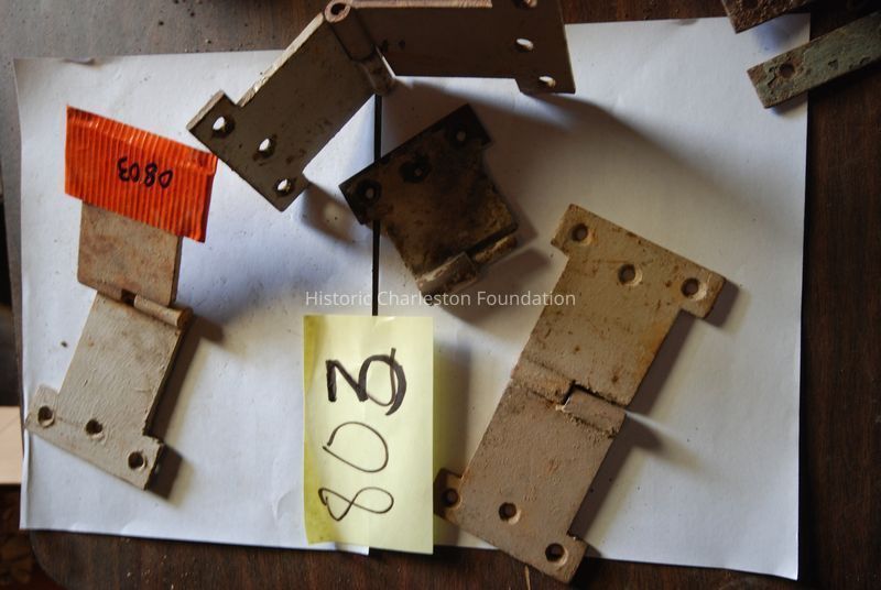 Six hinges from a set of seven mixed hinges, some of which have Parliament hinges. Five are complete, one is partial (g).Collection