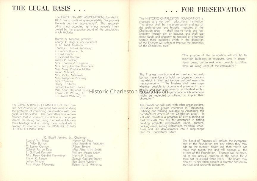 Institutional records of HCF's history, from its inception to present, including documents from the Civic Services Committee (the predecessor organization of HCF); minutes of trustee meetings; newspaper scrapbooks; directors' correspondence; some financial records; records of early preservation and neighborhood revitalization efforts; newsletters, annual reports, brochures, and event invitations; documents relating to HCF's currently and previously owned properties (Aiken-Rhett House, Nathaniel Russell House, Missroon House, 108 Meeting Street, Powder Magazine, McLeod); documents relating to the Festival of Houses & Gardens, Charleston International Antiques Show (CIAS), Reproductions, and other HCF programs.Collection