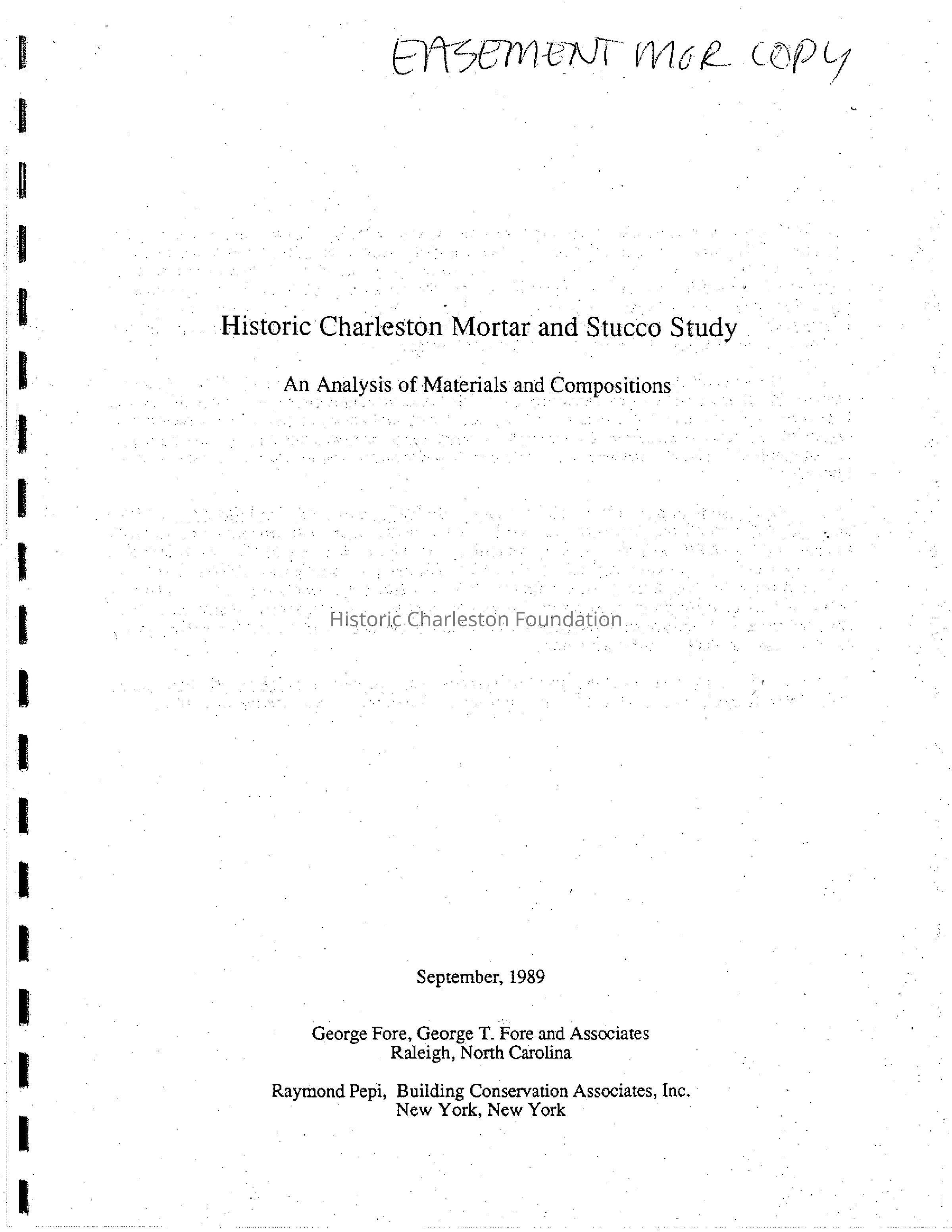 Study of historic mortars and stuccoes that was initiated and administered by HCF. It is a follow-up to a 1987 study of masonry and carpentry repair techniques in historic Charleston structures conducted by George T. Fore, et al.