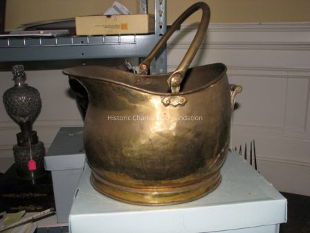 Brass coal scuttle with spout like trout basket, movable handle and small back handle.Collection