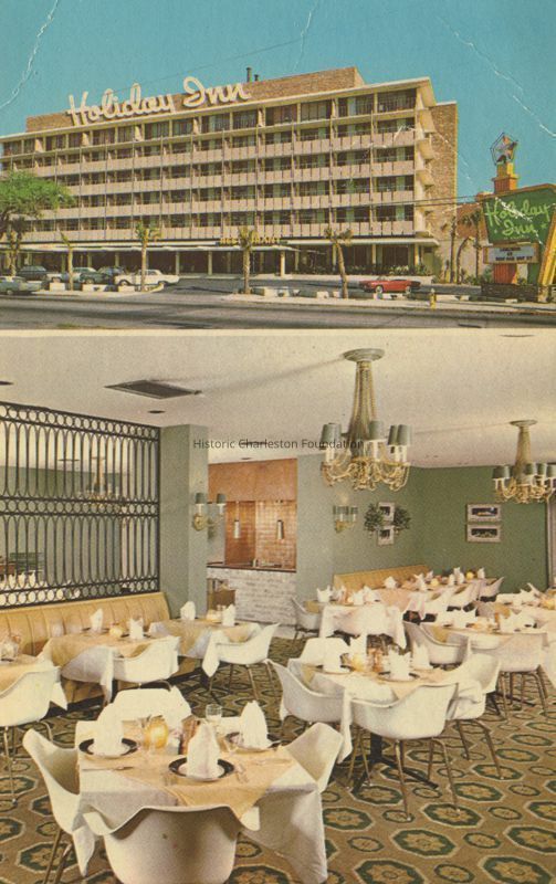 Photographic postcard featuring the Holiday Inn at the southeast corner of Calhoun Street and Meeting Street (125 Calhoun Street). Photograph of the exterior at top; photograph of the dining room at bottom.