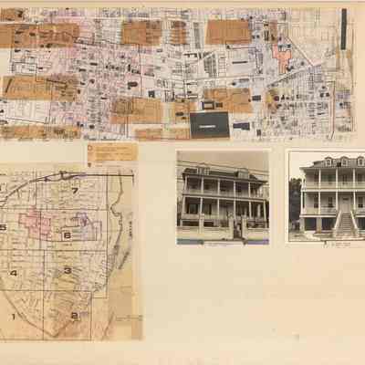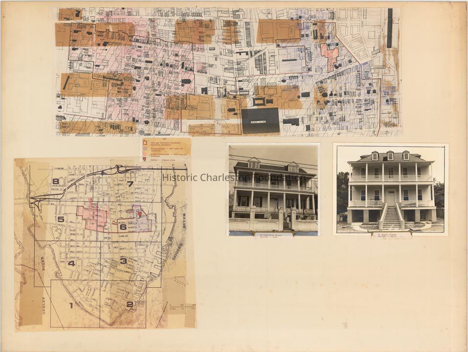 Map and photograph layout featuring homes purchased and restored by Historic Charleston Foundation through HCF's Home Ownership Program. Features B&W photographs of homes captioned with their purchase price and maps showing the boundaries of the program. Mounted on matte board. Photographs likely by Gregory Paxton; maps likely drawn by Frances Brawley, February 1979.