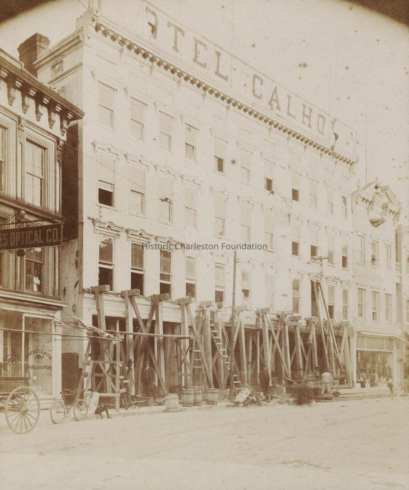 Hotel Calhoun (238-242 King Street) under repair, with ladders and scaffolding(?) shoring up the building at the ground story. Several workers stand or sit on sidewalk outside of the building. Also in view are portions of the Hines Optical Co. (left) and the building to its right.Context