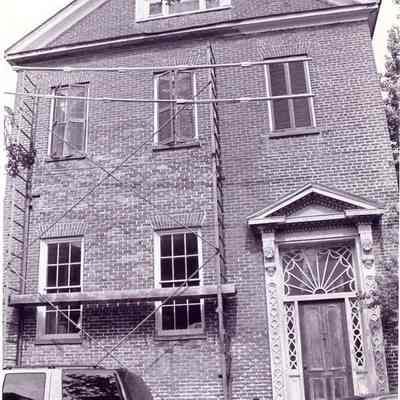 b: West (front) elevation. Front facade is under repair; scaffolding installed.