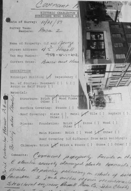 Hurricane Hugo, 1989, Hurricanes--South Carolina--Charleston County, Hurricane damage--South Carolina--Charleston County, Historic buildings--South Carolina--Charleston County--Conservation and restoration, SurveysArchive Details