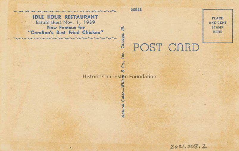 Caption on back of postcard: "Idle Hour Restaurant -- Established Nov. 1, 1939 -- Now Famous for 'Carolina's Best Fried Chicken'."