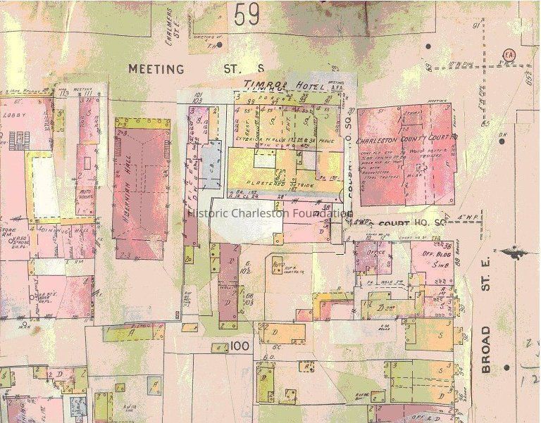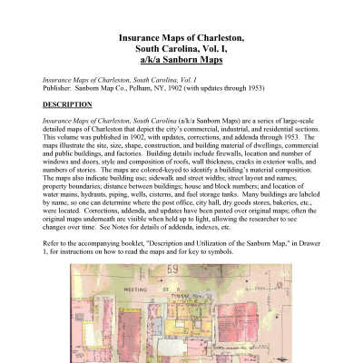 A series of large-scale detailed maps of Charleston that depict the city's commercial, industrial, and residential sections. This volume was published in 1902, with updates, corrections, and addenda through 1953. The maps illustrate the site, size, shape, construction, and building material of dwellings, commercial and public buildings, and factories. Building details include firewalls, location and number of windows and doors, style and composition of roofs, wall thickness, cracks in exterior walls, and numbers of stories. The maps are colored-keyed to identify a building's material composition. The maps also indicate building use; sidewalk and street widths; street layout and names; property boundaries; distance between buildings; house and block numbers; and location of water mains, hydrants, piping, wells, cisterns, and fuel storage tanks. Many buildings are labeled by name, so one can determine where the post office, city hall, dry goods stores, bakeries, etc., were located.
