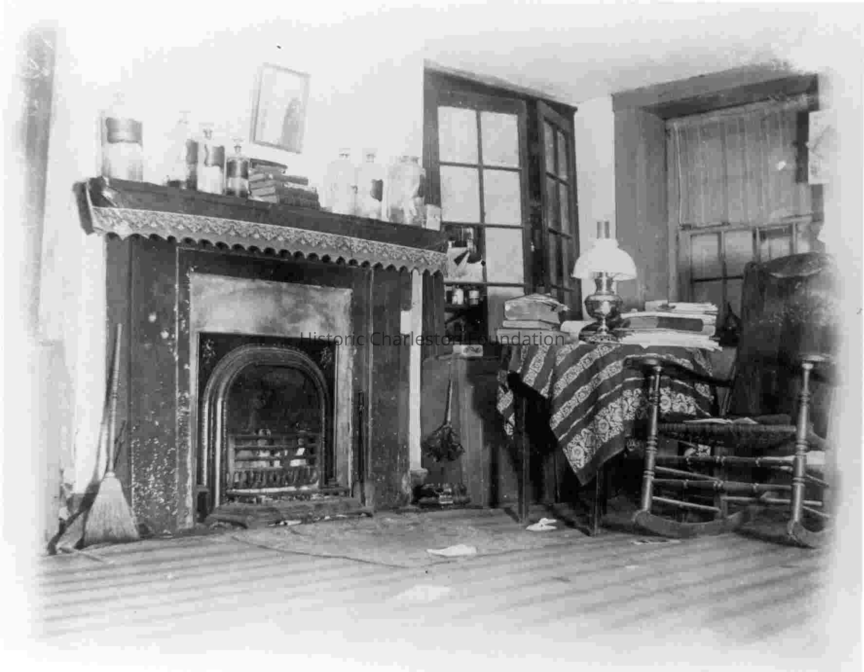 Photo is identified as the interior of 37 New Street, Dr. F.F. Sams' office. Originally entitled "Interior, Father's Office on New Street." Interior room with fireplace and mantel, rocking chair, small table with lamp and books on it. See exterior of house at 2004.021.111.Collection