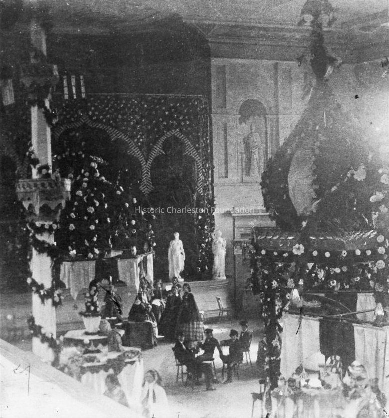Reprint of an 1860 photograph of the interior of Institute Hall, which was located at 134 Meeting Street. The room is decorated for Christmas and a party is being held.