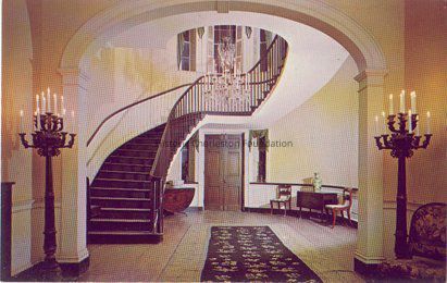 Circular stairway in the entrance hall of the Joseph Manigault House (350 Meeting Street) (color photographic print). Crystal chandelier and candelabras also featured.Collection