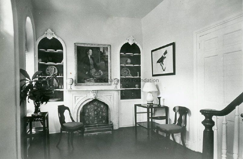 B&W photograph of an interior room of 118 East Bay Street, with fireplace and staircase. Then the home of Mrs. LaBar Hoagland, dated March 1964 (written on back of photo).Collection