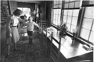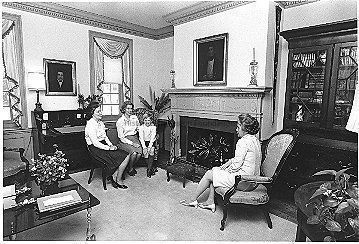 a: Interior room with fireplace and mantel. Jane Thornhill is seated at right. Two woman and a boy sit across from her.