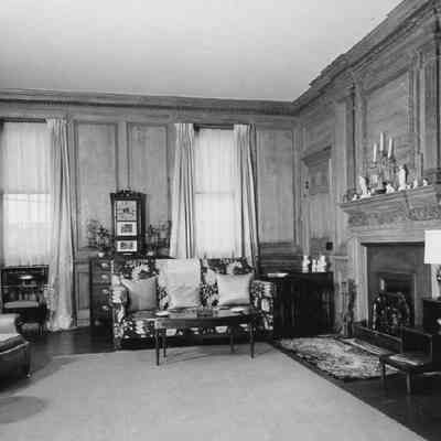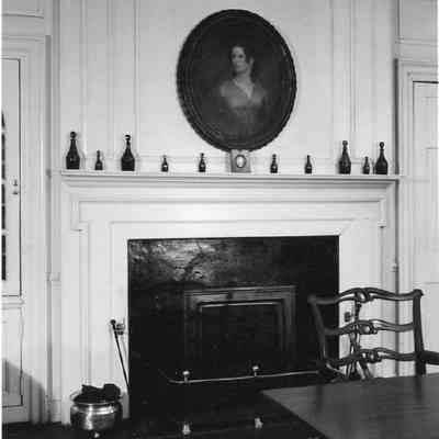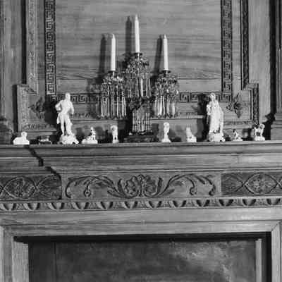 Twenty B&W photographs Branford-Horry House interiors, featuring several rooms. Features decorative woodwork, mantels, fireplaces (including with a Delft tile surround), archways, doors and doorways, furniture, and furnishings: