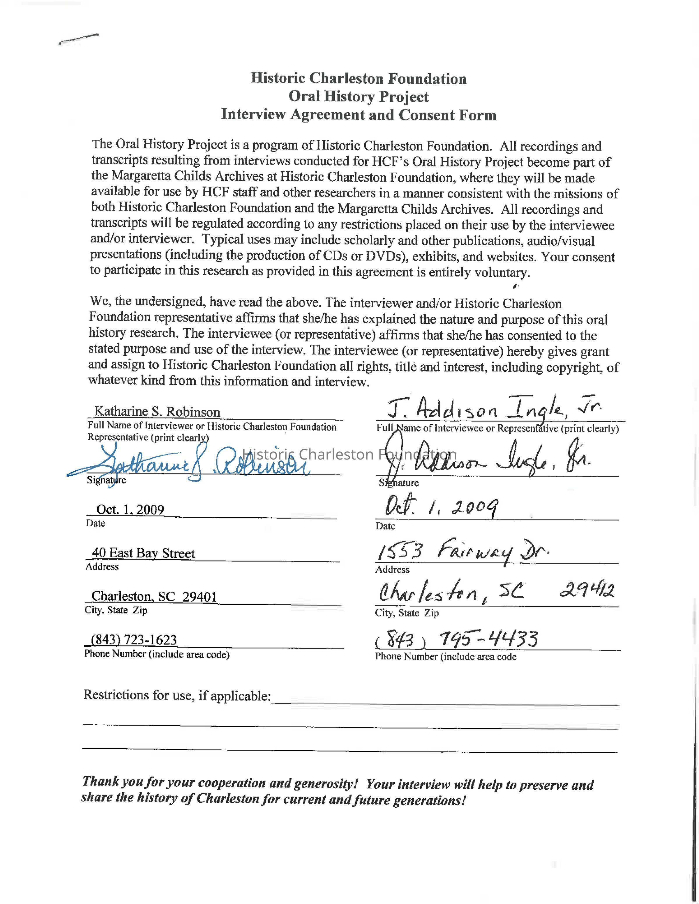 Interview with J. Addison Ingle, Jr. (Ad Ingle), former trustee, about Historic Charleston Foundation, historic preservation in Charleston, and life in Charleston throughout the years. Date of interview: Nov. 8, 2005. Interviewed by Jonathan Poston.
