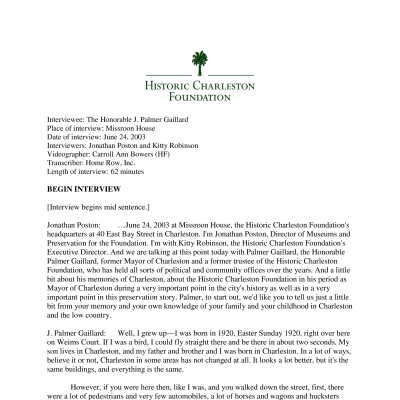 Interview with J. Palmer Gaillard, former trustee, about Historic Charleston Foundation, historic preservation in Charleston, and life in Charleston throughout the years. Date of interview: June 24, 2003. Interview conducted at HCF (Missroon House) by Kitty Robinson and Jonathan Poston.