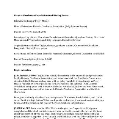 Interview with Joseph H. McGee (Peter McGee), former Historic Charleston Foundation trustee, about growing up in Charleston, his involvement with Historic Charleston Foundation, and historic preservation in Charleston. In particular, he reminisces about playing on The Battery, going to school, living conditions in Charleston, grocery stores, streetcars, and the 1938 tornado. He also discusses Frances Edmunds, HCF's Ansonborough Rehabilitation Project, and the National Trust Meeting in Charleston in 1970.