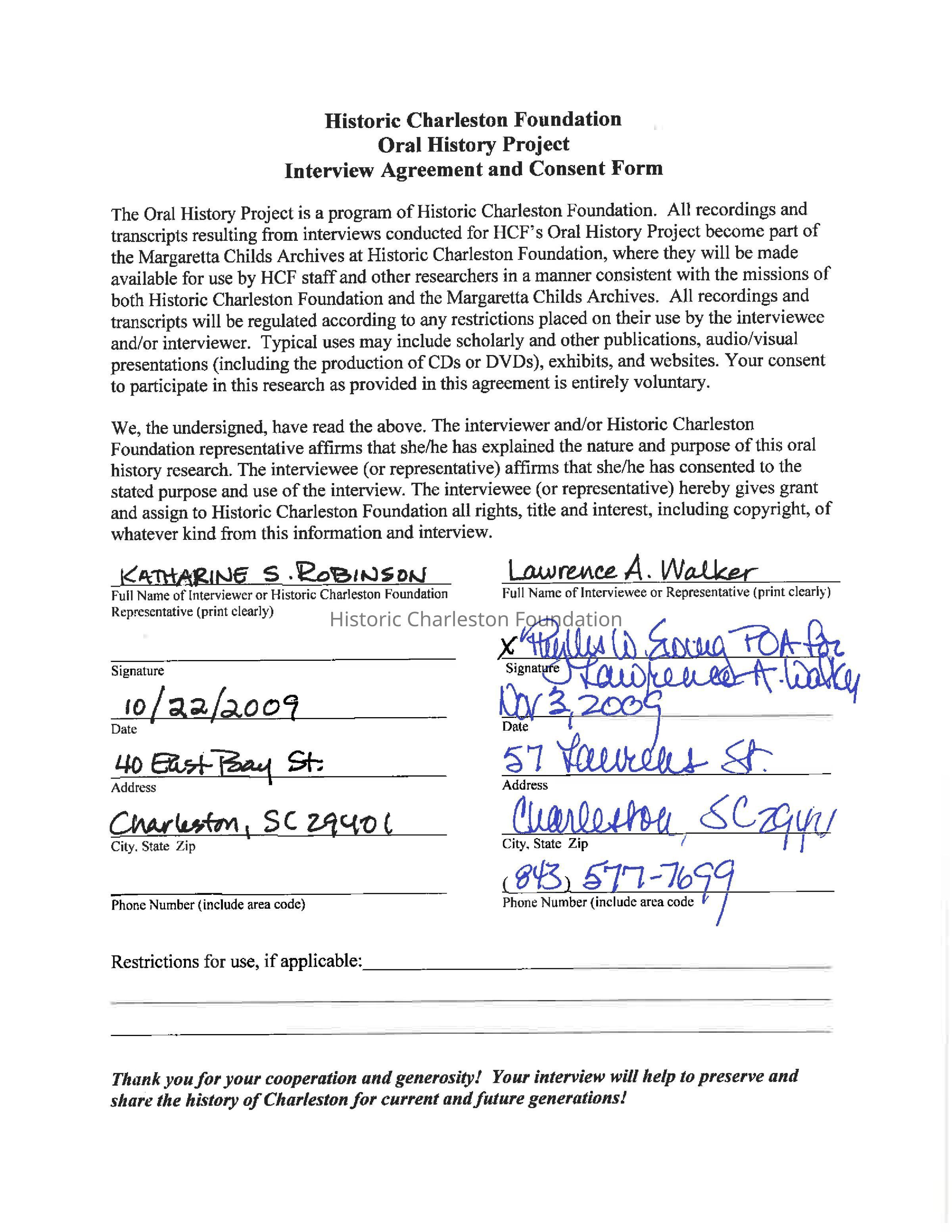 Interview with Lawrence Walker, former trustee and executive director, about Historic Charleston Foundation, historic preservation in Charleston, and life in Charleston throughout the years. Date of interview: Feb. 20, 2003. Interview conducted at HCF (Missroon House) by Kitty Robinson and Jonathan Poston.