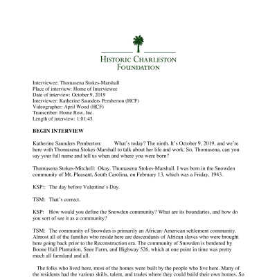 Interview of Thomasena Stokes-Marshall. Mrs. Stokes-Marshall was born in the African-American settlement of Snowden Community in what is now Mount Pleasant, South Carolina. At the age of three she moved with her family to New York City. The family stayed in NYC but frequently visited family members in the Snowden Community. Mrs. Stokes-Marshall talks about her childhood visits to South Carolina and her education, upbringing, and careers in policing and community organizing in New York. She moved back to her hometown in 1993 and relates her experiences with re-learning the area, learning about the history and culture of the Gullah-Geechee community, and becoming involved in the community. She recounts how she became interested in running for political office to affect improve the lives of her neighbors. Elected to Mt. Pleasant Town Council in 1998, she was the first African American woman to hold that position, and she served Town Council for 17 years. In 2004 she formed the Sweetgrass Cultural Arts Festival. She talks about the festival and her numerous other community projects including the Thomasena Stokes-Marshall Senior Center and the African American Historic Settlements Commission. Mrs. Stokes-Marshall describes her interest in the full spectrum of Gullah-Geechee history and culture and how volunteerism is a key factor in activating the community.