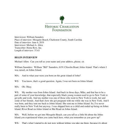Interview with William Saunders. “Bill” Saunders was born in New York City in 1935 but was raised on John’s Island by his mother’s family. He talks about the inter-connectedness and self-sufficiency of the Sea Islands, particularly John Island, James Inland and Wadmalaw Island. He talks about the importance of Mosquito Beach to the African American community. He recognizes the work of Bill “Cubby” Wilder and Laura and Andrew “Apple” Wilder in particular for the successes of Mosquito Beach. He says of Mosquito Beach,”…that’s the place I was free.” He reminisces about his lifetime of work in the struggle for human rights, including the Charleston Hospital Strike, and earlier violent racist episodes on Johns Island. Finally, Mr. Saunders recounts some experiences from his days with WPAL radio and he talks a bit about the music scene at Mosquito Beach.