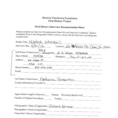 Date of interview: April 21, 2016. Interview conducted by Katherine Pemberton (HCF) at the McIntosh's home at 66 Anson Street. HCF staff April Wood and Holland Williams also present and asking questions. Richard Almes, videographer.