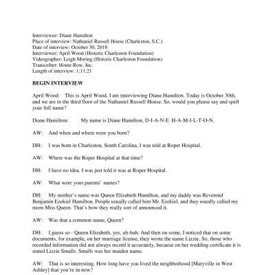 Date of interview: October 30, 2018. Interviewed by April Wood (HCF) at the Nathaniel Russell House (3rd floor). Leigh Moring, videographer.
