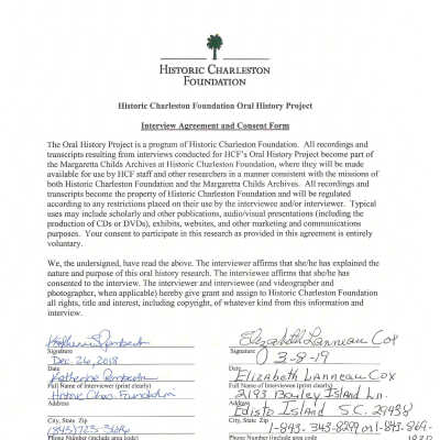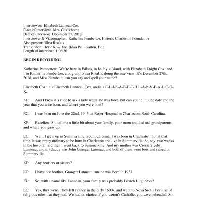 Date of interview: December 27, 2018. Interviewed and recorded by Katherine Pemberton (HCF) at Mrs. Cox's home in Summerville.
