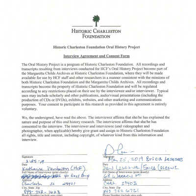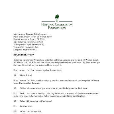 Interview of Erica and Dan Lesesne who purchased their home on Warren Street in 1989 from Historic Charleston Foundation through its Home Ownership Program (revolving fund). They are now some of the longest-term residents in the neighborhood in Radciffborough. The Lesesnes talk about the changes they have observed in the neighborhood including the demographics. For example, there had been many more older families who lived in there but they have moved out, and also are fewer African-American families than there used to be. They also describe the neighborhood as eclectic, which appealed to them. They discuss their experience purchasing the house from HCF and how they appreciate that it is protected by a covenant. They reminisce about Charleston architect Randolph Martz and also about Robert Ballard, who was the president of the neighborhood association and very involved in civic affairs. The Lesesnes also discuss their backgrounds. Mrs. Lesesne was an English teacher at Porter Gaud and an acting teacher. They also talk about spearheading an effort to preserve the family cemetery on Daniel Island.