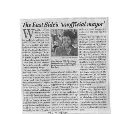 Interview with Joseph Watson, owner of the corner store located at 72 America Street. Watson recalls growing up on the East Side and the change that took place over his 67 years of living there. He discusses his mother at length and her strength and resilience to do whatever it took to raise her children as a single mom working several jobs. His mother, Mary Watson, opened up a restaurant in the same location where Watson's corner store is currently located, and called it Watson's Grill. Watson's ancestors were enslaved in Eutawville before the Civil War and were moved to this area to work on a local plantation. After freedom, two of the brothers were able to buy 72 acres in Parker's Ferry. Mr. Watson notes the changes in the boundaries of the east side, state of the schools in the area, involvement in the BAR, and addition of a community council. He worries that the cultural character of the neighborhood may get lost and the kind community and integrity that they have will be gone due to gentrification. Watson is able to recall several stores and landmarks that used to be in the area and different ethnicities of people living in the Eastside.