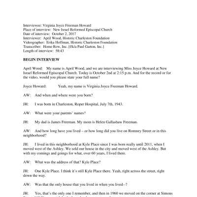 Interview of Joyce Howard, a woman who grew up in the North Central neighborhood of Charleston. The interview focuses on Ms. Howard's experiences growing up in the neighborhood, what her childhood house and neighborhood were like (and how it has changed), where she was allowed to shop and go to as a young woman. She talks about having been recruited for college, her experiences during the Civil Rights era in Charleston and in Alabama where she went to college, and also voting and registering to vote, including how people had to pass a literacy test. She recalls times when Black entertainers who come to perform in Charleston and where they'd be able to stay, and going to Atlantic Beach (near Myrtle Beach) because Charleston area beaches were segregated. (She mentions Mosquito Beach but not as a "water beach" but one with clubs and houses.) She also reflects on the shootings at Emanuel A.M.E. Church and the impact the City on the nation impressed by the local response and as an impetus for many people to move here. Ms. Howard is a long-term member and leader of New Israel Reformed Episcopal Church.