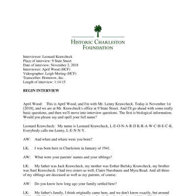Interview of Leonard ("Lenny") Krawcheck who grew up on Colonial Street and still lives in the same house he grew up in that his parents purchased in 1927. Mr. Krawcheck describes his family life; his neighborhood and schooling; what he did for recreation and entertainment; his father's business, Jack Krawcheck's menswear [313 King Street]; the places his family shopped for groceries and goods; and about life in Charleston in general. He also talks about the Jewish community in Charleston; his perception of race relations; and the changes in the practice of law since he began his career until the present. He also discusses his experience as Chairman of the Board of Zoning Appeals (BZA) over several decades, the various threats to the city, and the importance of zoning laws.
