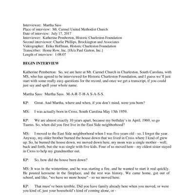 Interview with Martha Sass, a woman who was raised in the East Side of Charleston. When she was a child, the family moved to Charleston from Cross, SC after the family house burned down there. They first lived on Line Street, then moved to the projects. While living on Line Street, she started attending Mt. Carmel United Methodist Church where she remains very active and involved. Mrs. Sass discusses living in the East Side; her sometimes difficult family life and her social life; going to school (Sanders Clyde, then C.A. Brown) and college (South Carolina State University); various grocery and department stores in the neighborhood and downtown; recreational activities including ice skating at County Hall, going to The Battery, and going to Folly and Mosquito Beach; moving to New York after high school then moving back to Charleston; meeting her husband; her involvement with the Church; Hurricane Hugo; etc. She reminisces about Cross, SC, where she visited throughout her early childhood. She also discusses the changes she has seen in the neighborhood both positive and negative, and her concerns about the future of the East Side. While she feels that she didn't experience racism directly, she was aware of racism and other racial divides in Charleston, and shares a story about her brother's marriage to a Vietnamese woman.