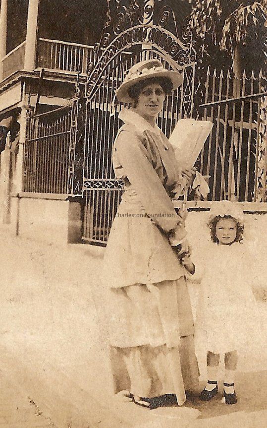 a: Woman and young girl in front of William Aiken House gates.