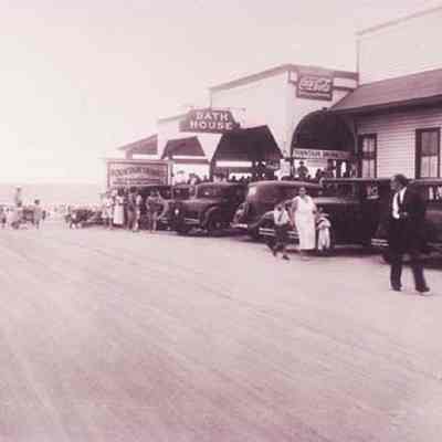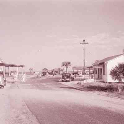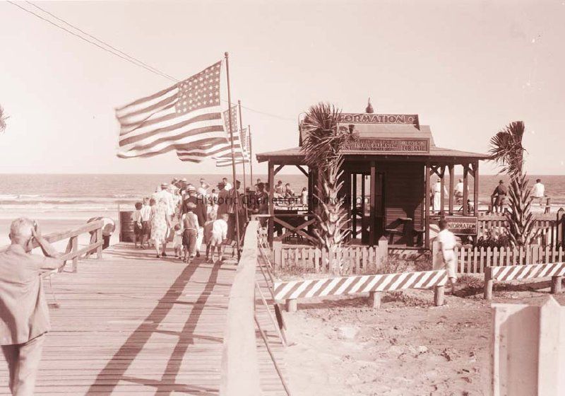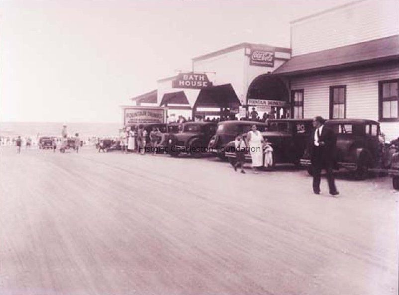 g: IOP boardwalk to the Bath House and a soda shop(?) with signs for "Fountain Drinks" and Coca-Cola in front.