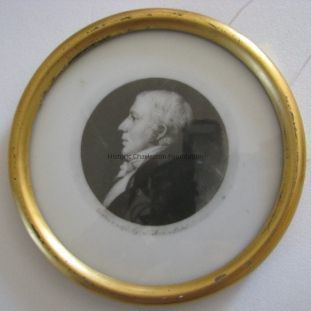 Portrait of James Carey: "Drawn & engr. by S. Memin Plulad" written at bottom of figure: depicting sitter in profile, turned right, having light hair, wearing black coat and white tie, on light background: Original circular gilt wood frameCollection
