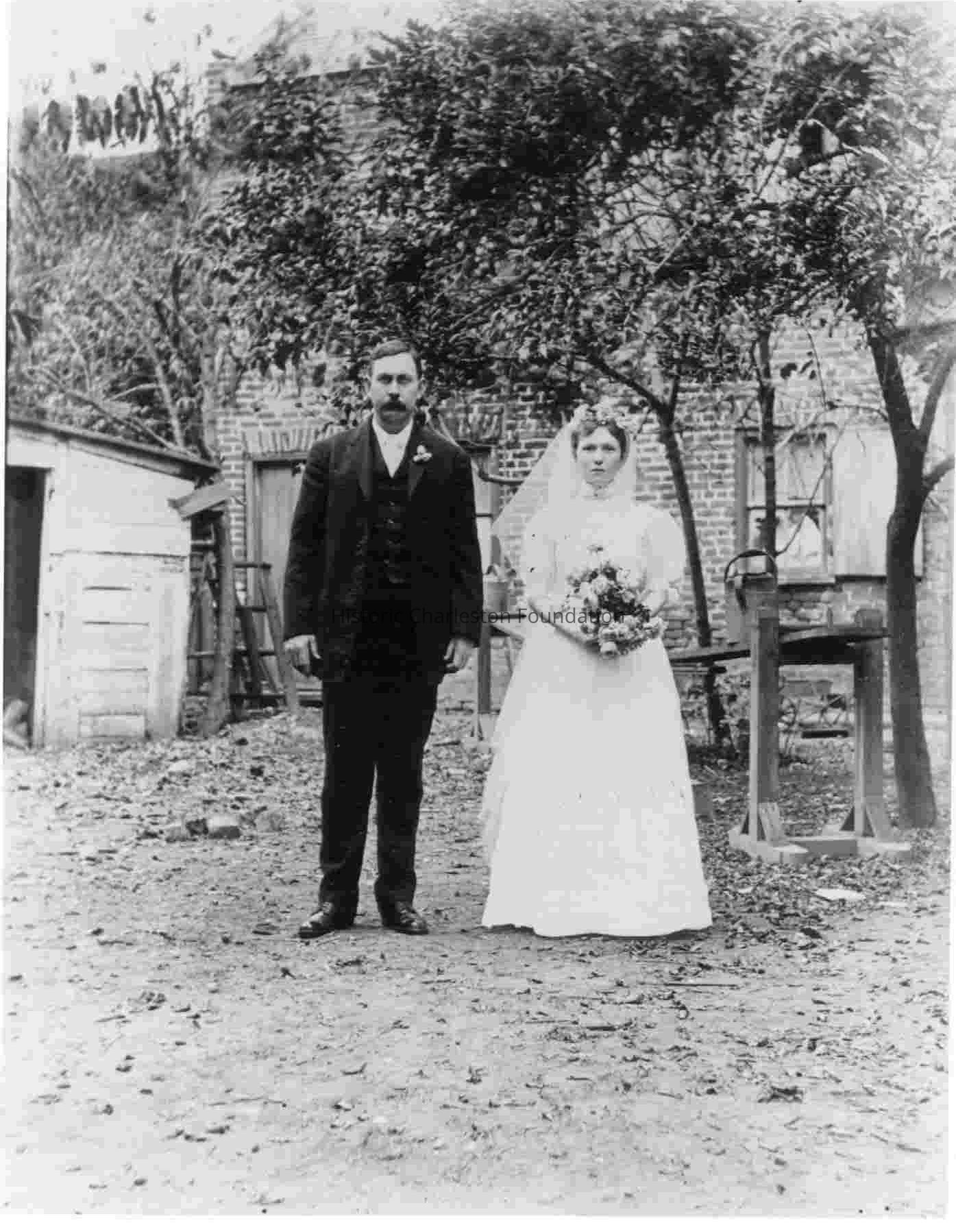 Bride and groom standing in a backyard, near a joggling board. Photo originally identified as James H. Legare and Lila Gregorie Legare on the day of their wedding.Collection