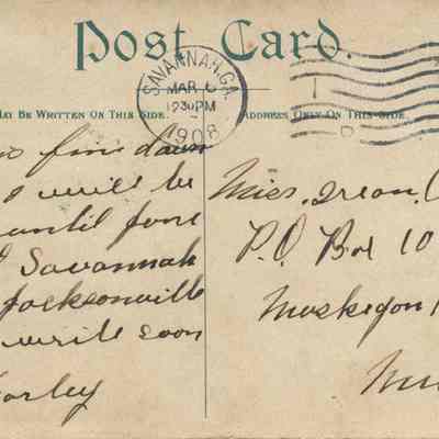 Back of postcard is postmarked March 6, 1908, and has a one-cent postage stamp.