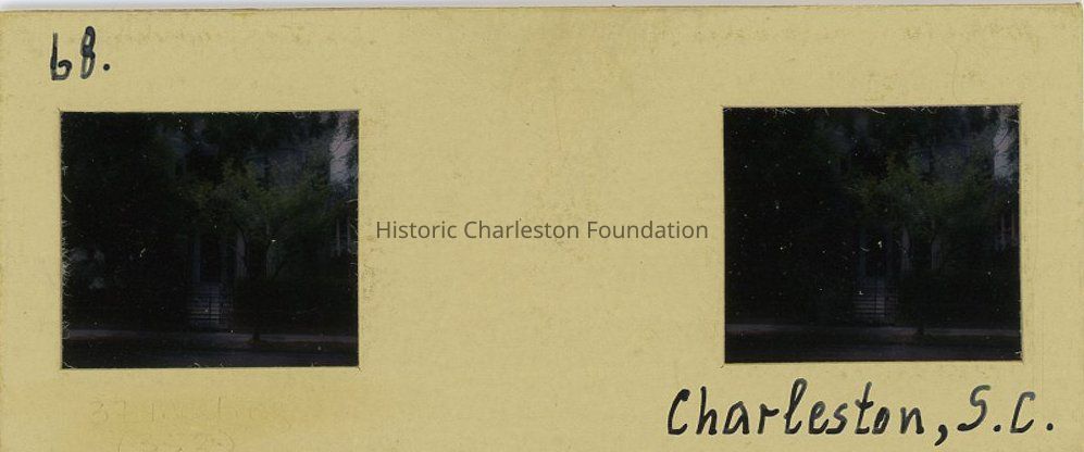 Color stereoscope slide* of the James Simmons House (37 Meeeting Street). View partially obscured by trees.