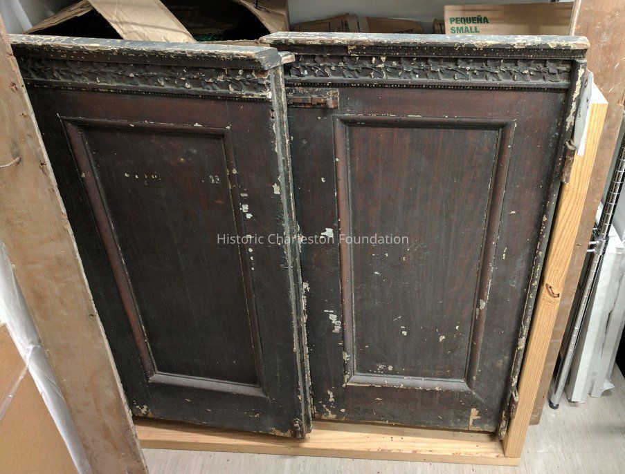 Pair of jib doors approximately half the height of a standard door. The top of the doors is decorated with an intricate trim which includes a bead and floral pattern running the length of the top. The paint finish is a deep brown. Currently set in a wooden frame to preserve it and provide structure.