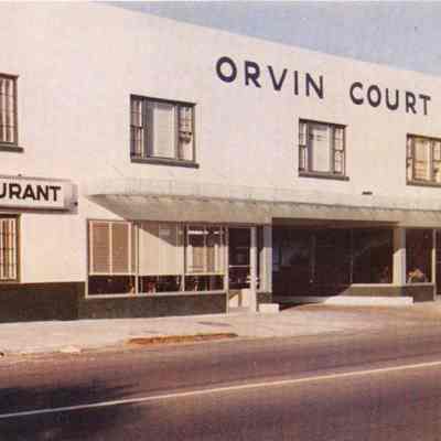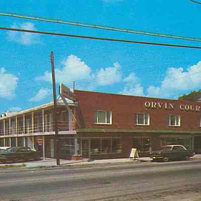 b: Ca. 1960 B&W postcard of the Orvin Court. Sign advertising "air conditioned" projects from the front of the building. Sign "Restaurant" hangs over the window at left.