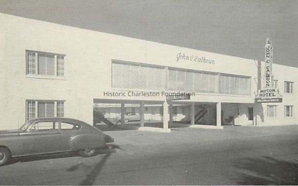 a: Ca. 1953 B&W postcard of the building operating as the John C. Calhoun Motor Hotel. A 1949-50 Chevrolet Fleetline Sedan is in the foreground, and a 1953 Buick is in the background.