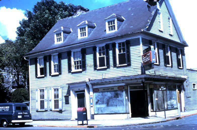 The photo appears to have been taken after Poulnot's Pharmacy closed; the windows have been smeared with white paint.Collection